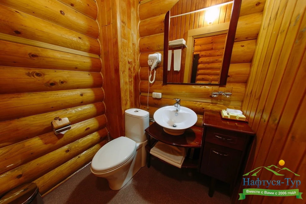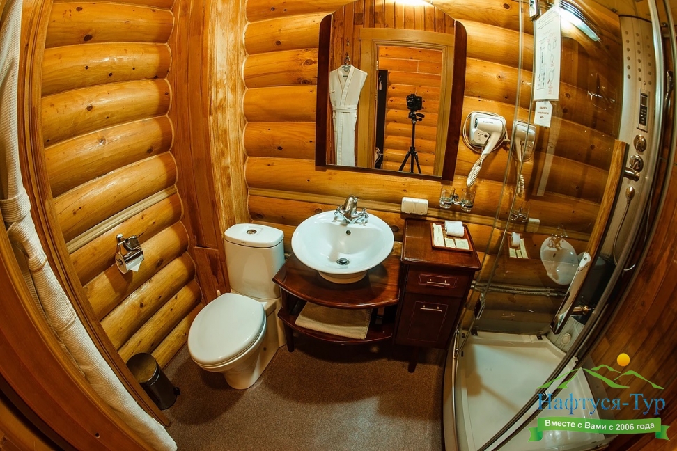 с душевой кабиной, тапочки, туалетные принадлежности, фен, халат