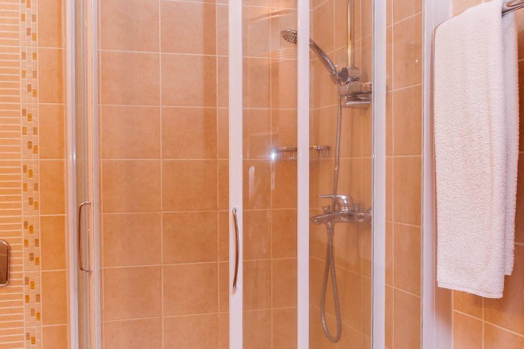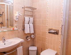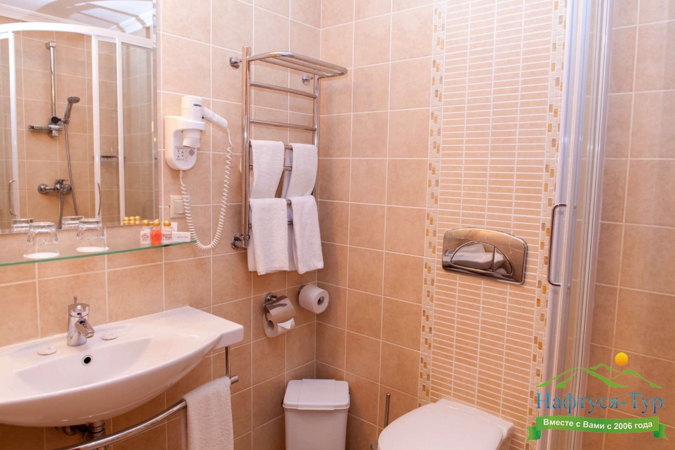 с душевой кабиной, туалетные принадлежности, фен