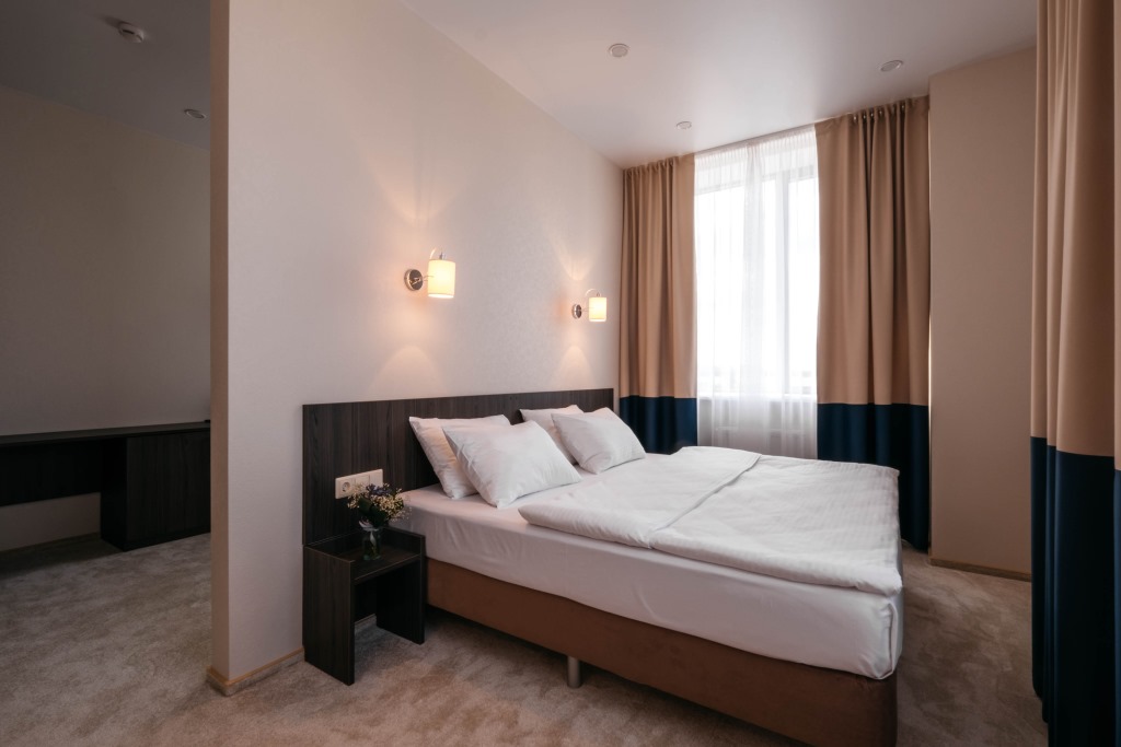 Здание отеля имеет оригинальную архитектуру и напоминает корабль, украшенный галеонной фигурой на носу. В отделке фасада используется много стекла, что придает зданию дополнительную легкость. Для размещения предусмотрено 38 номеров трех категорий. Во всех номерах – ТВ, холодильник, телефон, фен. В номерах повышенной комфортности – дополнительно халаты и тапочки.