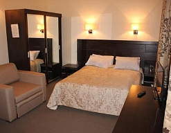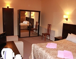 вешалка, ковровое покрытие, кресло-кровать, кровать двуспальная, прикроватные тумбочки, столик туалетный, тумба багажная, шкаф