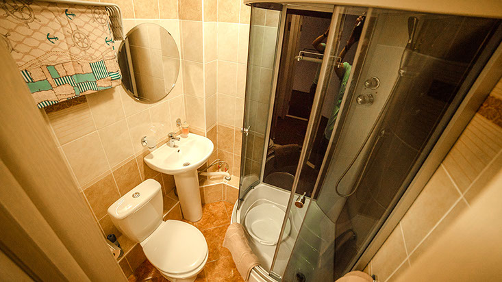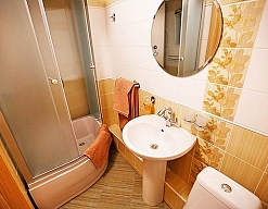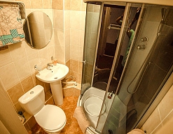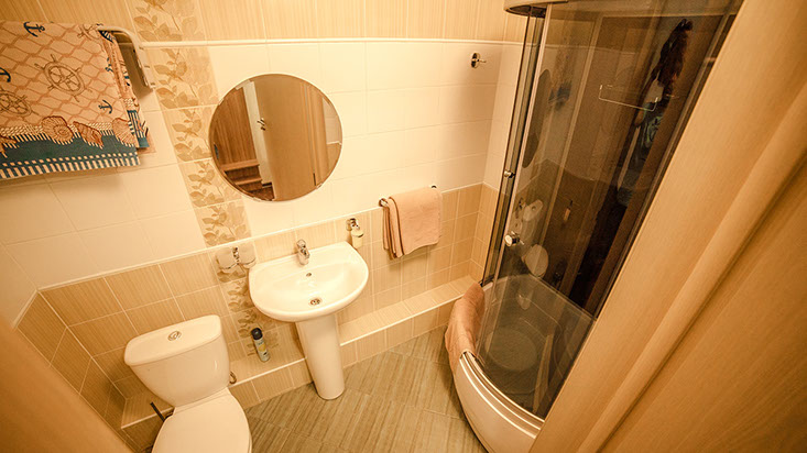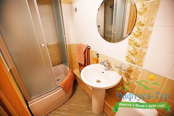 с душевой кабиной, туалетные принадлежности, фен