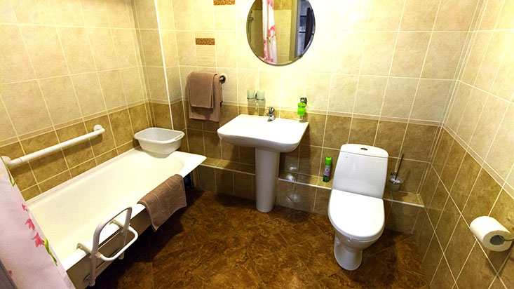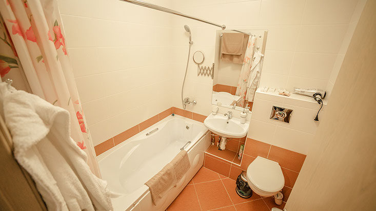 с ванной, тапочки, туалетные принадлежности, фен, халат