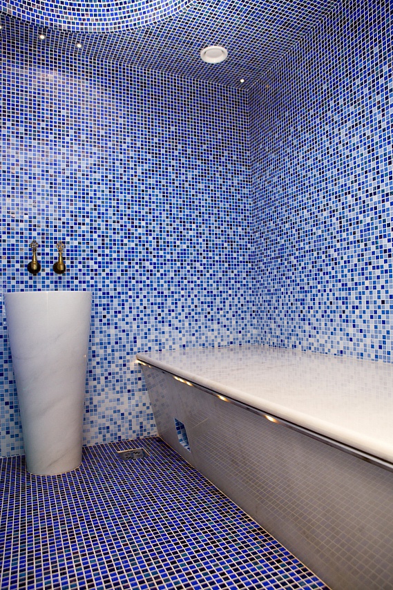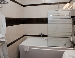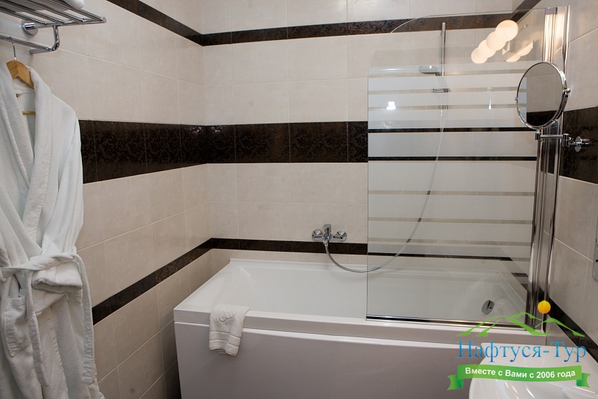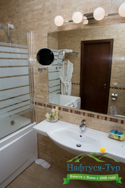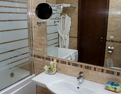 с ванной, тапочки, туалетные принадлежности, фен, халат