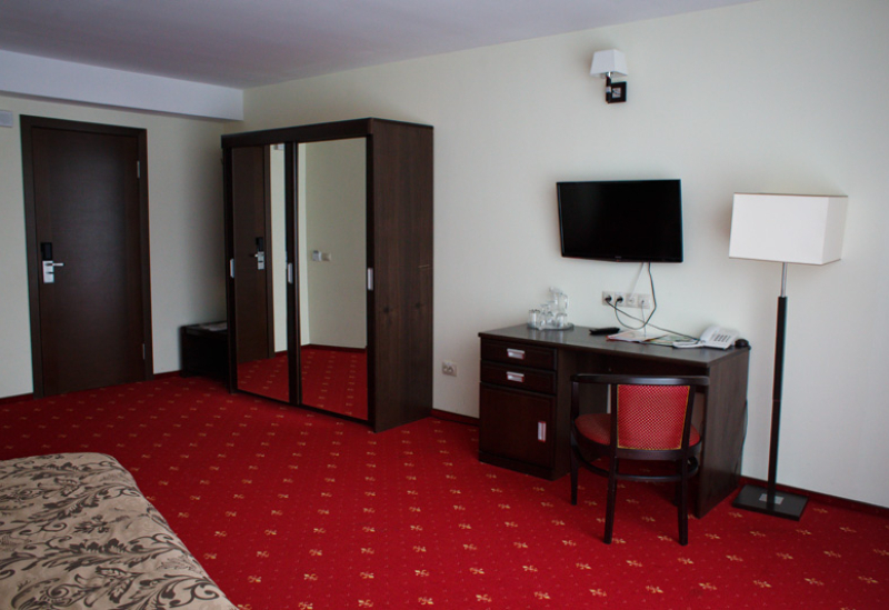 вешалка, зеркало, ковровое покрытие, кровать двуспальная, прикроватные тумбочки, стол, стул, шкаф