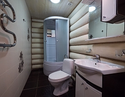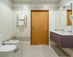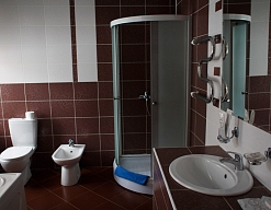 с ванной и душевой кабиной, тапочки, туалетные принадлежности, фен, халат